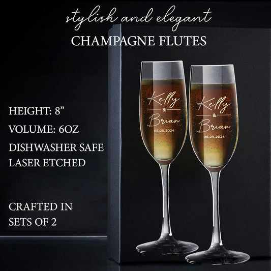 Personalized Champagne Flutes Set of 2, Wedding Gifts for Bride and Groom with Couple's Names and Date, Customized Champagne Flutes, Modern Toasting Glasses