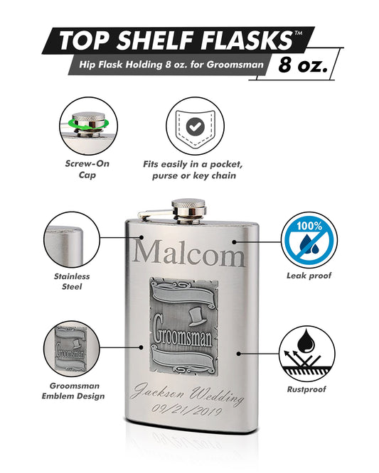 Top Shelf Flasks Personalized Custom Engraved 6oz Stainless Steel Groomsman Tuxedo Flask for Weddings, True Metal Etching Lasts a Lifetime