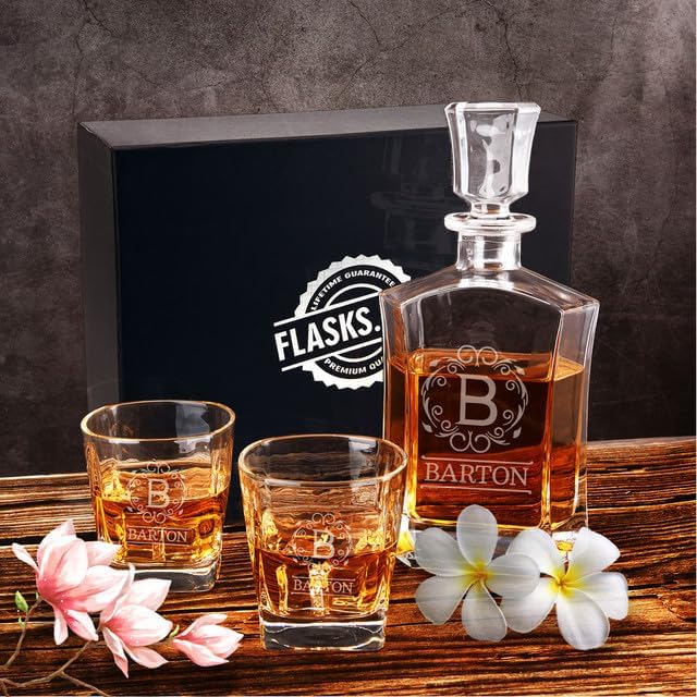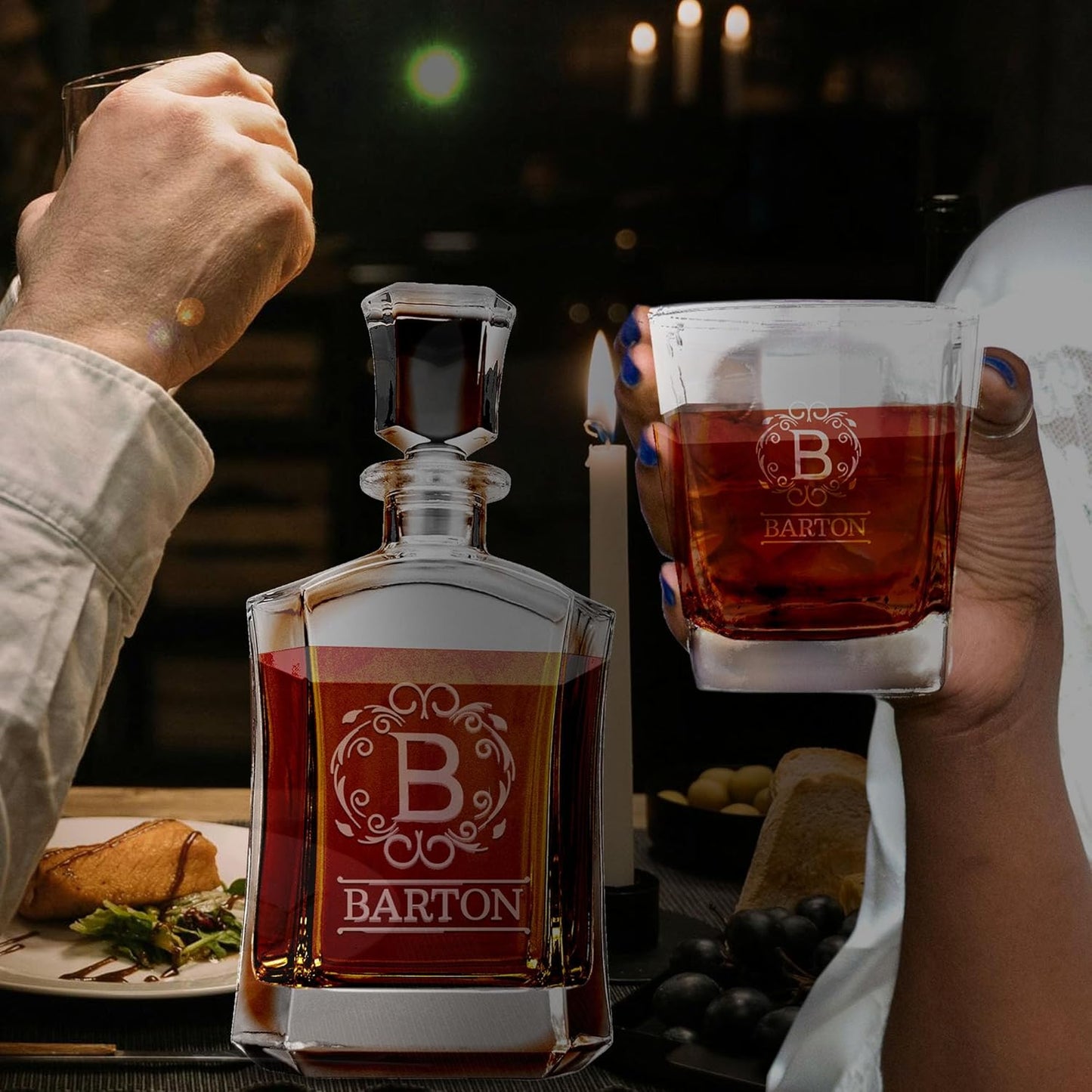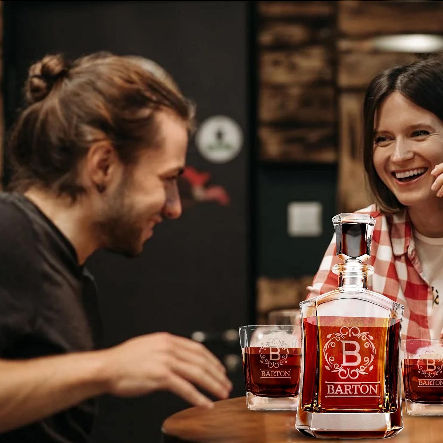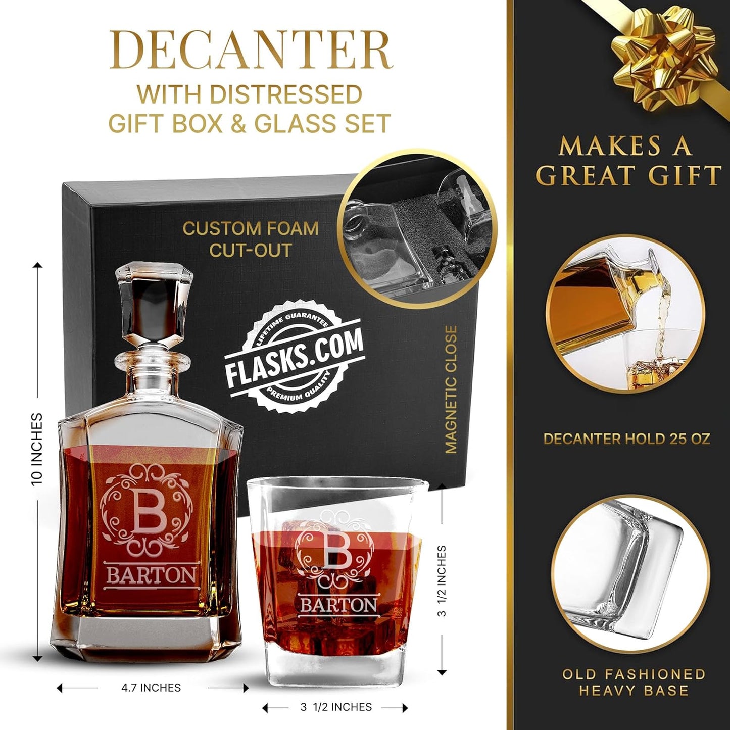 SALE - 35% OFF AT CHECKOUT - Personalized Whiskey Decanter Set | Custom Engraved 25 oz, 750ml Liquor Decanter w/Whiskey Glasses Set